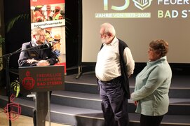 Gebannt verfolgten die Gäste den eigens gedrehten Film, der einen Einblick in die Geschichte „150 Jahre Feuerwehr Bad Steben“ gab. „Statt vieler Worte, lassen wir Bilder sprechen“, teilte der Vorsitzende Tobias Diezel mit und auch, dass ein „Videoteam“ in nicht gezählten Stunden den Film erstellte, beginnend im Herbst 2022. In drei Abschnitten von 1823 bis 1913, bis 1963 und schlussendlich bis 2023 erlebten die Gäste die Geschichte und den Wandel der Wehr, dazwischen sprachen Ehrengäste und Ehrungen sind überreicht worden.