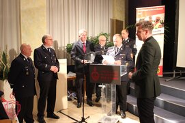 Für je 40 Jahre aktive Dienstzeit heftete Kreisbrandrat Marco Kolbinger den Brandschützern Achim Hetzel und Michael Horn, letzterer zugleich Kommandant und Kreisbrandmeister das Feuerwehr-Ehrenzeichen für 40-jährige aktive Dienstzeit in Gold an die linke Brusttasche der Uniform. Landrat Oliver Bär und Bürgermeister Bert Horn überreichten Präsente, dankten für die langjährige Treue verbunden mit der Hoffnung auf weitere aktive Einsatzjahre. Zudem erhielten die Brandschützer „eine Woche Gratisaufenthalt“ im Feuerwehrerholungsheim „Sankt Florian“ in Bayerisch Gmain. Die jeweilige Laudatio verlas stellvertretender Kommandant Rainer Singer, der auch die Lehrgänge, Weiter- und Fortbildungen auflistete. So legten beide Feuerwehrdienstleistenden die Leistungsprüfungen „Technische Hilfeleistung“ wie auch „Gruppe im Löscheinsatz“ bis zur Endstufe Gold-Rot ab. Achim Hetzel kann auf die Ausbildung Zugführer blicken, die er 2008 absolvierte. Er agierte als Vertrauensmann, Kassenprüfer und ist vom Dienstgrad Hauptlöschmeister. Michael Horn war von 1986 an acht Jahre lang Jugendwart. Auch heute noch liegen ihm die Kinder und Jugendlichen am Herzen, so dass die Arbeit stetige Unterstützung genießt. Von 1996 bis 2004 agierte er als stellvertretender Kommandant, folgte dann Helmut Singer im Amt des Kommandanten nach. Dieses hat er bis heute inne und agiert zudem seit 2009 als Kreisbrandmeister.