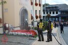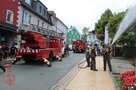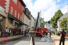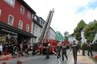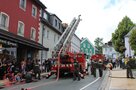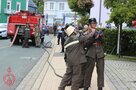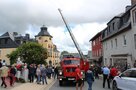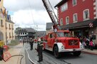 Die historische Schauübung am Rathaus eröffnete das zweitätige Festwochenende. Viele kleine und große Zaungäste verfolgten das „Löschspektakel“ und zig Kameras hielten das Geschehen fest. Kommandant und Kreisbrandmeister Michael Horn und Zugführer Johannes Hagen kommentierten die Übung, gaben Einblick in Technik und die damalige Vorgehensweise. Zum Einsatz kamen ein Löschgruppenfahrzeug (LF 16), ein Tanklöschfahrzeug (TLF 16) und eine Drehleiter (DL 30), die zusammen ein Magirus-Löschzug bildeten. Zudem waren alle Übungsteilnehmer in alte „Feuerwehrklamotten“ geschlüpft, die mit der heutigen Einsatzkleidung nichts gemein haben. Interessant die DL, deren Wenderohr zum Löschen in luftiger Höhe „per Strick“ vom Boden aus bedient worden ist. Das Baujahr der Drehleiter wird mit 1968 beziffert, gebaut im Klöckner-Humboldt-Deutz AG Werk Ulm. Das TLF 16, Baujahr 1963 kam als Neufahrzeug zur Bad Stebener Wehr und war bis 2010 im Einsatzdienst. Seit der „Ausmusterung“ steht das Fahrzeug im Oberfränkischen Feuerwehrmuseum in Schauenstein. „Zur Ausstattung gehören sechs B-Schläuche a´ 20 Meter, sieben C-Schläuche a´ 15 Meter, eine vierteilige Steckleiter aus Holz und Einreißhaken“, listet der Kommandant auf und auch, dass der Löschwassertank 2400 Liter fasst und eine Schnellangriffseinrichtung mit 30 Meter Druckschlauch dazugehört. Der Löschwassertank des LF 16 umfasst 800 Liter und die Ausstattung umfasst unter anderem eine zweiteilige Schiebeleiter und eine vierteilige Steckleiter jeweils aus Holz. „Das Fahrzeug konnte als selbstständige taktische Einheit zur Durchführung von Löschangriffen, Förderung von Löschwasser und Hilfeleistungen bei Notständen eingesetzt werden.“