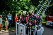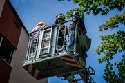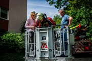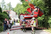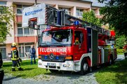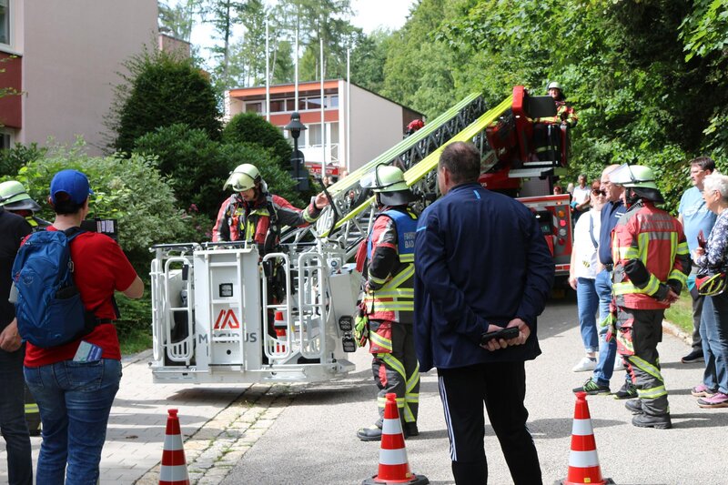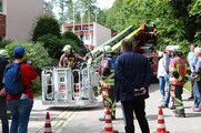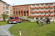 Das Szenario: Zwölf Personen sind von Brandrauch eingeschlossen – ihre Rettung erfolgte über die Drehleiter der Bad Stebener Wehr. Das war kein leichtes Unterfangen, erfolgte doch der Ausstieg über das Fenster im Flur. Die Personen – eine mit Krücken – mussten auf das Fensterbrett und in den Korb der Drehleiter klettern. Mit vier Rettungsvorgängen brachten die Feuerwehrleute die eingeschlossenen Personen, gemimt von Patienten und Personal, sicher auf den Boden. Hier übernahmen Sanitäter der BRK-Bereitschaft die Betreuung, begleiteten die Geretteten zum Verletztensammelplatz und versorgten sie je nach angenommenen Verletzungsmuster.