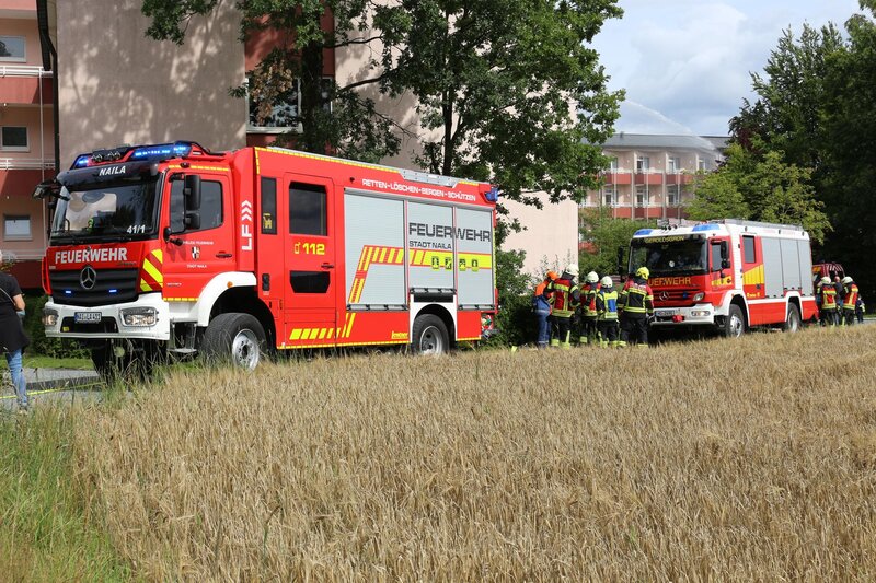 Zahlreiche Schaulustige beobachteten das Übungsszenario, zu dem auch das Löschen gehörte. Auf der Rückseite der Klinik war die Drehleiter der Nailaer Wehr postiert, um den imaginären Brand aus luftiger Höhe zu löschen. Die Löschwasserversorgung erfolgte über das Hydrantennetz und vom nahe gelegenen Teich am Kurpark.