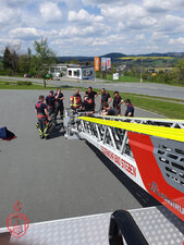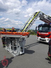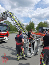 Weiter ging es mit der Abnahme des Drehleiterkorbes. Unser Drehleiterkorb RC400-C bietet Platz für bis zu 4 Personen und hat eine Nutzlast von 400 kg. Die Demontage des Korbes erfordert eine genaue Absprache zwischen Drehleitermaschinist und Drehleiterbesatzung. Das Abnehmen des Korbes kann gerade im sogenannten „kleinen Kranbetrieb“ zum Beispiel bei der hängenden Rettung einer Person Vorteile bieten. Deshalb folgte eine Geschicklichkeitsübung mit Anfahren an eine „Hauswand“ durch Einweiser und Drehleitermaschinist.