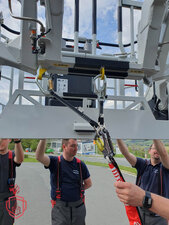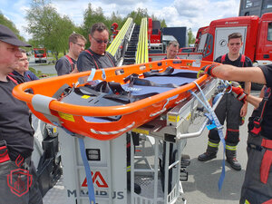 Nachdem der Rettungskorb der Drehleiter und seine Funktionen nochmals verinnerlicht wurden, widmeten wir uns seinen Anbauteilen wie zum Beispiel dem Wenderohr. Das mittlerweile am häufigsten genutzte Anbauteil der Drehleiter folgte im Anschluss, die Krankentragehalterung samt Schleifkorbtrage. Hier gibt es die Möglichkeit die Halterung auf dem Korb zu montieren oder alternativ die Schleifkorbtrage hängend unter dem Korb zu Benutzen. Bei beiden Varianten ist es enorm wichtig sorgfältig zu Arbeiten und eine redundante Sicherung vorzunehmen.