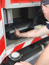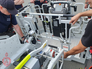 Als letztes wurde der Notbetrieb der Drehleiter besprochen und geübt. Der Notbetrieb ist mit das wichtigste Basiswissen eines jeden Drehleitermaschinisten. Sollte die Drehleiter aus irgendeinem Grund eine schwere technische Fehlfunktion aufweisen und sich nicht mehr verfahren lassen, muss die ausgefahrene Leiter trotzdem sicher zum Boden zurückgefahren werden können.